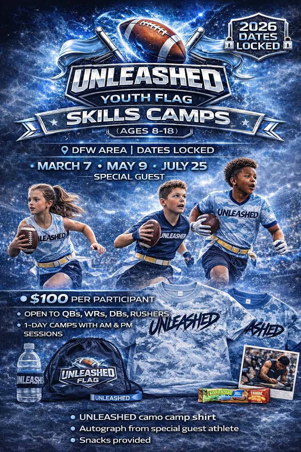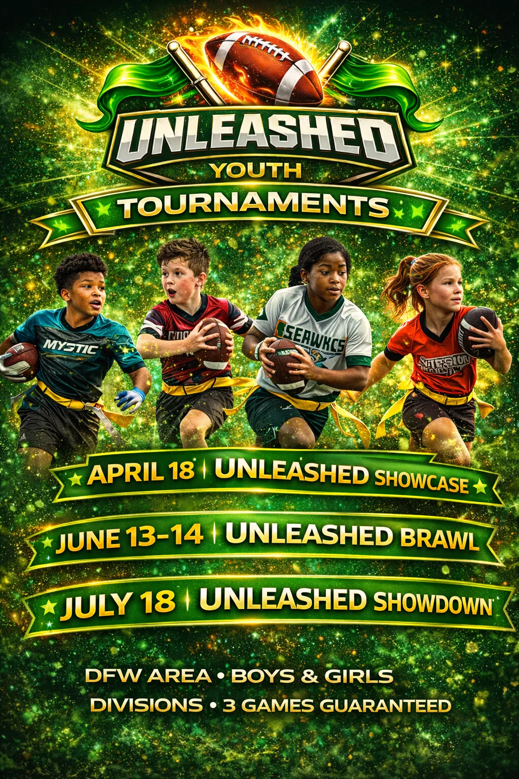 Unleashed Flag Foundation is a Dallas–Fort Worth nonprofit running competitive flag football leagues, tournaments, skills camps, and showcase events. Whether you’re registering a team, joining as a player, or backing the mission with a donation, you’re in the right place.